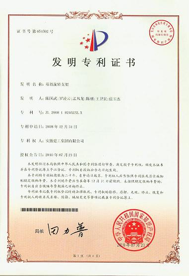 2010年7月21日,國(guó)家知識(shí)產(chǎn)權(quán)局授予安徽建工集團(tuán)“幕墻旋轉(zhuǎn)支架”發(fā)明專利權(quán),并頒發(fā)了“發(fā)明專利證書”。