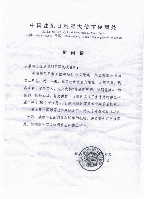 中國駐尼日利亞使館經(jīng)商處于“五一”國際勞動(dòng)節(jié)向我援尼日利亞醫(yī)院項(xiàng)目部發(fā)來慰問信,向奮斗在項(xiàng)目施工現(xiàn)場(chǎng)的安徽建工集團(tuán)廣大職工表示節(jié)日的祝福和問候。