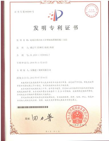 2012年7月4日,由安徽建工集團(tuán)有限公司自主研發(fā)的“陡坡巖質(zhì)河床上異型深水圍堰的施工方法” 獲得國家知識(shí)產(chǎn)權(quán)局發(fā)明專利授權(quán)(專利號(hào):ZL 2010 1 0556962.7)。