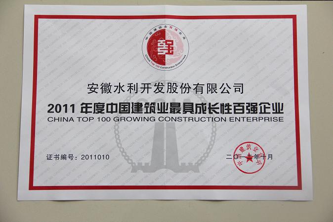 10月22日,從2011年度中國(guó)建筑業(yè)企業(yè)雙百?gòu)?qiáng)暨2012年度全國(guó)建筑業(yè)AAA級(jí)信用企業(yè)發(fā)布會(huì)上傳來(lái)喜訊,安徽水利榮獲2011年度中國(guó)建筑業(yè)最具成長(zhǎng)性百?gòu)?qiáng)企業(yè)第十名。