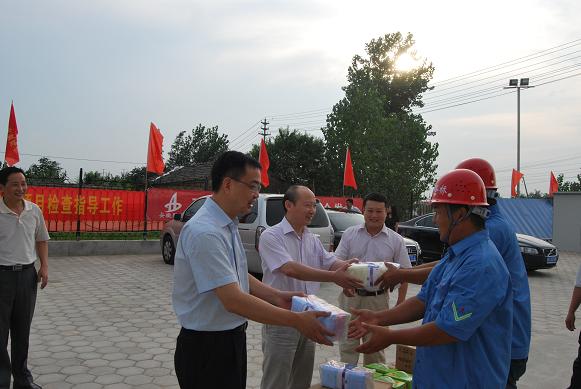 7月17日,安徽建工集團公司董事長、黨委書記趙時運,在副董事長、黨委副書記李長斌,紀委書記、工會主席牛曙東等同志的陪同下,到省路橋公司合肥市G206公路改建工程項目部,深入工地,看望慰問施工一線的職工,了解工程進展情況,征詢廣大一線職工的意見,并給他們送去了防暑降溫用品。