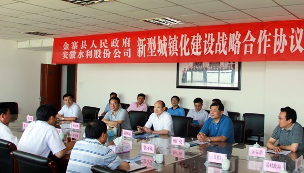 2013年8月1日上午,安徽水利與金寨縣人民政府在金寨縣政府九樓會(huì)議室舉行簽約儀式,簽署《新型城鎮(zhèn)化建設(shè)戰(zhàn)略合作協(xié)議》,就金寨縣縣城及現(xiàn)代產(chǎn)業(yè)園區(qū)舊城改造、新區(qū)開發(fā)、保障性住房、道路橋梁、河道治理等138億重點(diǎn)建設(shè)項(xiàng)目進(jìn)行投資合作。安徽水利總經(jīng)理?xiàng)顝V亮和金寨縣常務(wù)副縣長李衛(wèi)東代表雙方簽約。六安市委常委、金寨縣委書記潘東旭、常務(wù)副縣長李衛(wèi)東,安徽建工集團(tuán)黨委書記、董事長、安徽水利董事長趙時(shí)運(yùn),安徽建工集團(tuán)董事、安徽水利總經(jīng)理?xiàng)顝V亮,安徽水利常務(wù)副總經(jīng)理陳圣剛,安徽建工集團(tuán)財(cái)務(wù)資產(chǎn)部主任李有貴、安徽路橋公司董事長汪衛(wèi)東等出席簽約儀式。