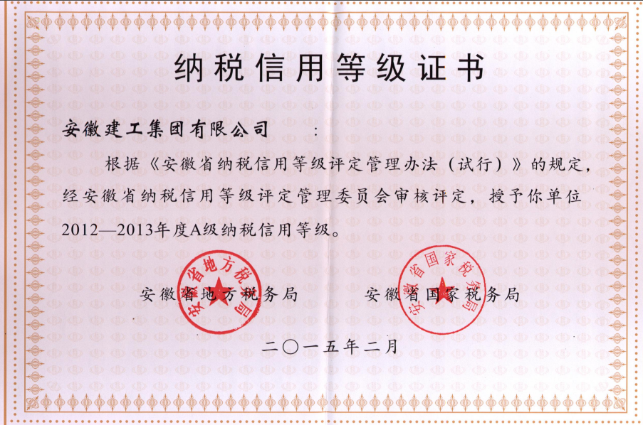近日,在省國稅局、地稅局聯(lián)合舉辦的2012-2013年度納稅信用等級評定中,安徽建工集團有限公司被評定為“A級納稅信用單位”,該結(jié)果是對安徽建工多年來良好納稅信用狀況的綜合反映。