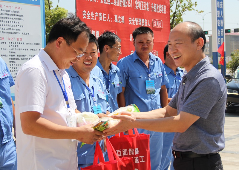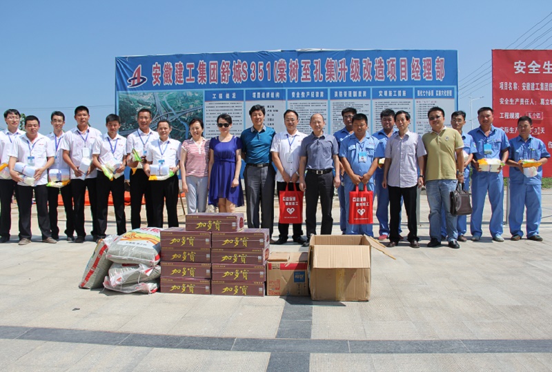 7月30日,集團公司董事長趙時運在工會主席徐曉光等領(lǐng)導(dǎo)的陪同下,冒著高溫酷暑來到舒城S351(棠樹至孔集段)改擴建項目,看望慰問了高溫下奮戰(zhàn)在施工一線的工程公司、路橋公司的工程建設(shè)者,并為他們送去了毛巾、綠豆、白糖、風(fēng)油精、十滴水等防暑降溫用品。