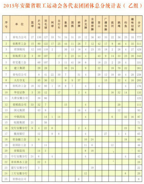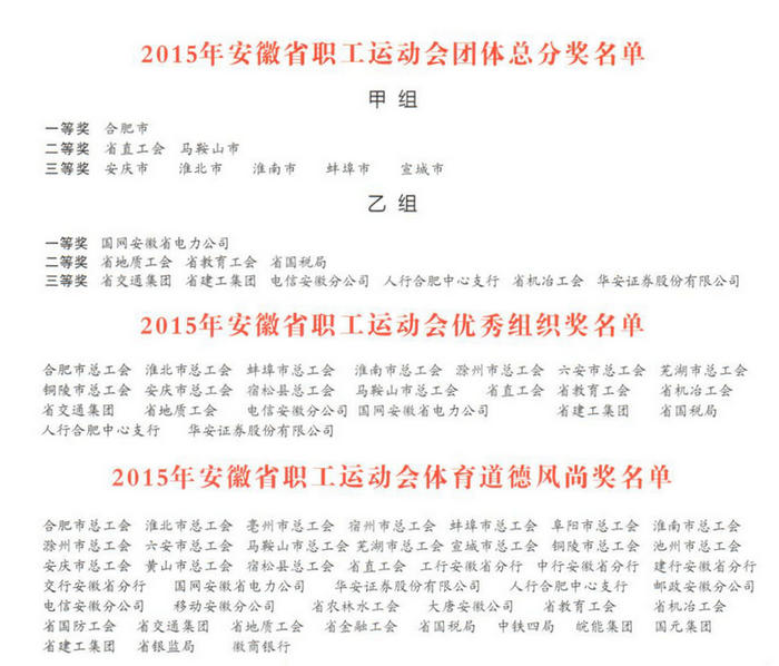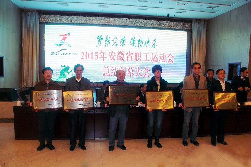 11月16日,“勞動(dòng)光榮•運(yùn)動(dòng)快樂”2015年安徽省職工運(yùn)動(dòng)會(huì)總結(jié)閉幕大會(huì)在合肥召開。會(huì)議對(duì)本屆運(yùn)動(dòng)會(huì)優(yōu)勝單位進(jìn)行表彰。安徽建工集團(tuán)代表隊(duì)經(jīng)過團(tuán)結(jié)拼搏,取得優(yōu)異成績,獲得運(yùn)動(dòng)會(huì)團(tuán)體總分獎(jiǎng)乙組三等獎(jiǎng),并被運(yùn)動(dòng)會(huì)組委會(huì)授予“優(yōu)秀組織獎(jiǎng)”和“體育道德風(fēng)尚獎(jiǎng)”榮譽(yù)稱號(hào)。