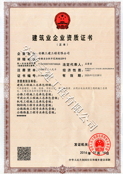 1月20日,安徽三建公司從國家住建部捧回了建筑工程施工總承包特級資質(zhì)、工程設(shè)計建筑行業(yè)甲級資質(zhì)。據(jù)悉,特級資質(zhì)是住建部核定的我國建筑施工企業(yè)最高資質(zhì),其中建筑工程施工總承包特級資質(zhì)企業(yè)可承接建筑、公路、鐵路、市政公用、港口與航道、水利水電各類別工程的施工總承包、工程總承包和項目管理業(yè)務(wù)。安徽三建晉升特級資質(zhì)后,在高端房建領(lǐng)域?qū)]有任何障礙;除此之外,該公司主營業(yè)務(wù)范圍涵蓋公路、鐵路、市政公用、港口與航道、水利水電等業(yè)務(wù),為企業(yè)實(shí)現(xiàn)“十三五”創(chuàng)新發(fā)展、協(xié)調(diào)發(fā)展、綠色發(fā)展、開放發(fā)展、共享發(fā)展奠定堅實(shí)基礎(chǔ)。