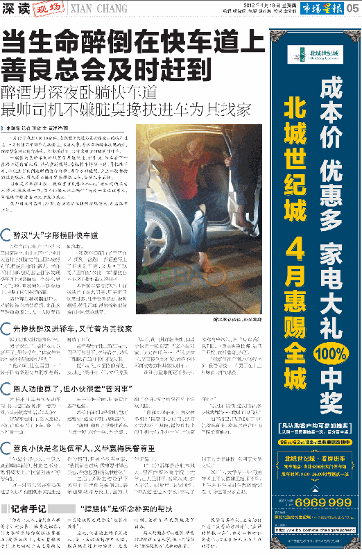 4月19日,《市場星報》整版刊登了題為《當(dāng)生命醉倒在快車道上善良總會及時趕到》的報道,記述了安徽建工技師學(xué)院經(jīng)濟(jì)管理系老師孟祥同志主動幫助酒醉路人的事跡,引起了社會的關(guān)注,讀者們對孟祥同志高度的社會責(zé)任感、樂于助人精神給予了高度評價,省內(nèi)各大網(wǎng)站紛紛轉(zhuǎn)載該報道。集團(tuán)公司向全體職工發(fā)出“向孟祥同志學(xué)習(xí),讓雷鋒精神常駐”的號召,希望全體建工人能夠以孟祥同志為榜樣,推己及人,助人為樂,讓文明之風(fēng)溢滿建工。(下面全文轉(zhuǎn)載這篇通訊報道)