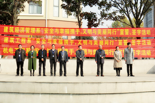 為保障學(xué)院學(xué)生身心健康,培養(yǎng)學(xué)生良好品行,有效預(yù)防青少年犯罪,對(duì)青少年的不良行為及時(shí)進(jìn)行預(yù)防和矯治,建筑經(jīng)濟(jì)管理系、建筑工程系、機(jī)電工程系與11月28日中午12:30分聯(lián)合組織學(xué)生開展了以“安全與幸福攜手,文明與美麗同行”為主題的宣誓、簽名活動(dòng)。副院長(zhǎng)任建設(shè)、呂良玉、德育工作部蘇曉紅主任、團(tuán)委書記陳卓、三系主任、書記及全體學(xué)生管理人員參加了此次活動(dòng)。