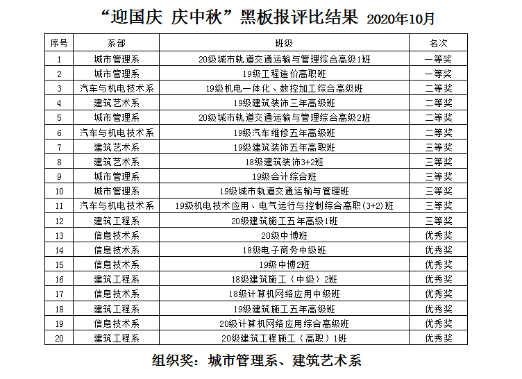 此次黑板報(bào)評(píng)比活動(dòng)自9月下旬開(kāi)始以來(lái),經(jīng)過(guò)五系、直屬部的層層篩選,最終推選出26個(gè)班級(jí)進(jìn)入學(xué)院參評(píng)。各班級(jí)圍繞主題精心策劃,結(jié)合系部專業(yè)特點(diǎn),設(shè)計(jì)出了主題鮮明、版面整潔、內(nèi)容新穎、圖文并茂的作品,整體水平較往屆有很大的提高。評(píng)委組嚴(yán)格依據(jù)評(píng)分標(biāo)準(zhǔn),進(jìn)行仔細(xì)的檢查,認(rèn)真的評(píng)判,評(píng)選出一等獎(jiǎng)2個(gè),二等獎(jiǎng)4個(gè),三等獎(jiǎng)6個(gè),優(yōu)秀獎(jiǎng)8個(gè),組織獎(jiǎng)2個(gè),獲獎(jiǎng)情況如下:
