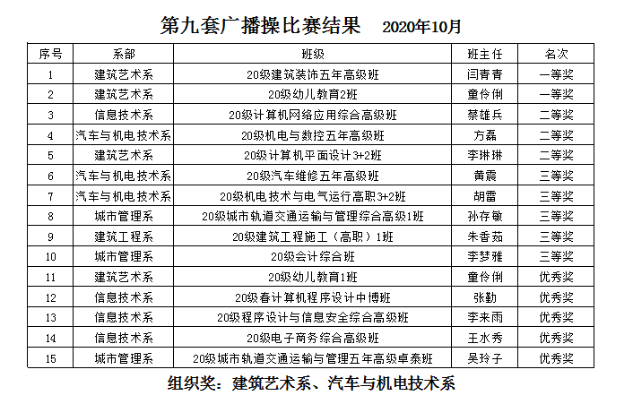 此次廣播操比賽,為各個班級搭建了團結(jié)、拼搏、健康、向上的平臺,既鍛煉了學(xué)生的體魄,又培養(yǎng)了學(xué)生的組織性和紀律性和集體榮譽感,增強了各班級凝聚力,充分展示了我院學(xué)生朝氣蓬勃和奮發(fā)向上的精神風(fēng)貌。
