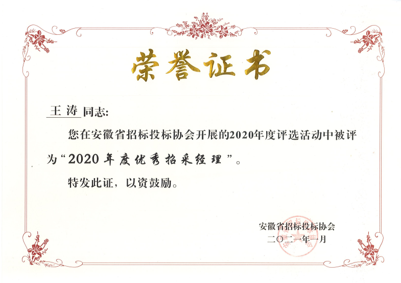 黨員、集團(tuán)招標(biāo)中心王濤同志榮獲安徽省招標(biāo)投標(biāo)協(xié)會(huì)評(píng)為