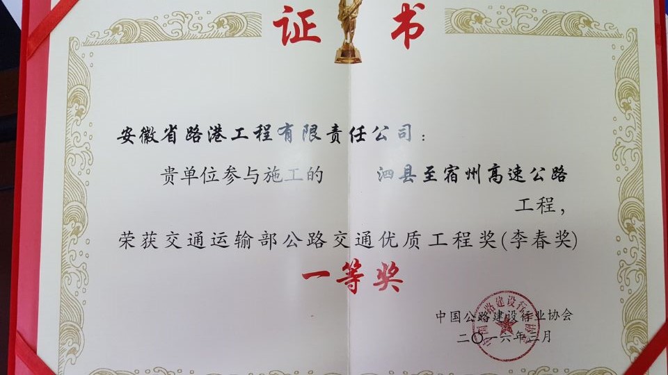 近日,由安徽路港公司承建的安徽省泗縣至宿州高速公路十標(biāo)榮獲全國(guó)公路交通優(yōu)質(zhì)工程獎(jiǎng)(李春獎(jiǎng))一等獎(jiǎng),全國(guó)共9項(xiàng)工程獲得該項(xiàng)殊榮。