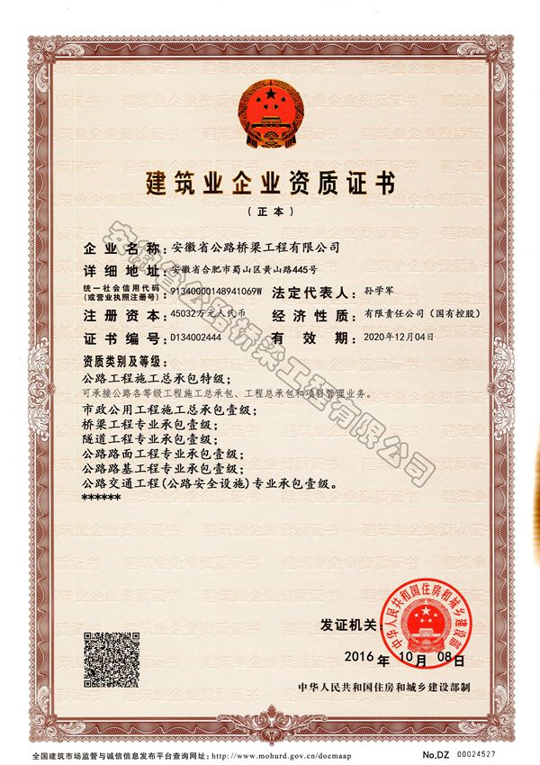 近日,住房和城鄉(xiāng)建設(shè)部發(fā)布公告,安徽路橋公司特級(jí)資質(zhì)順利獲批,成為安徽省內(nèi)首家也是唯一一家同時(shí)擁有公路工程施工總承包特級(jí)資質(zhì)和公路行業(yè)工程設(shè)計(jì)甲級(jí)資質(zhì)的企業(yè)。