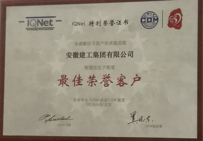 2016年12月1日,“2016年方圓標(biāo)志認(rèn)證集團(tuán)獲證客戶交流會”在合肥召開,安徽建工集團(tuán)榮獲方圓標(biāo)志認(rèn)證集團(tuán)“最佳榮譽客戶”。