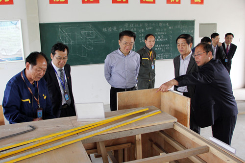 在視察過程中,劉總一行一邊認真聽取了學院實訓與信息化中心陳陸龍主任的介紹,一邊還饒有興致地觀看學生和實訓指導(dǎo)老師制作的瓷磚鑲貼、內(nèi)墻隔斷、數(shù)控加工零件、小型辦公家具等實習作品。