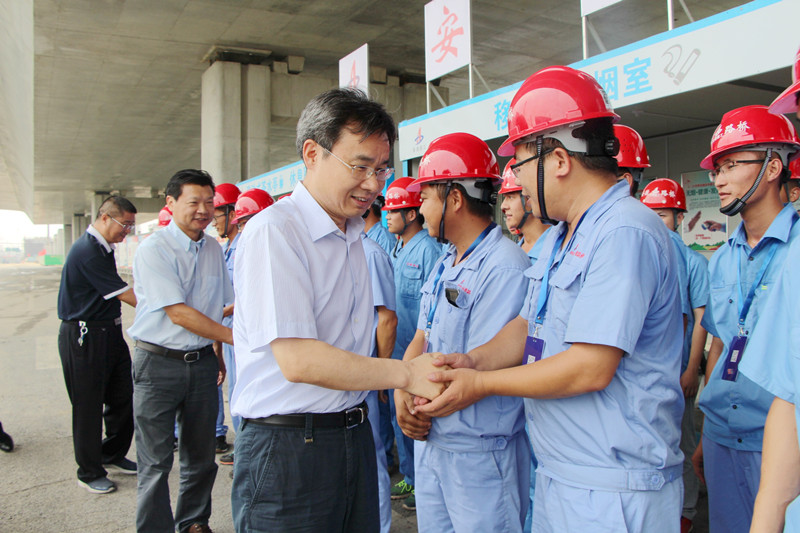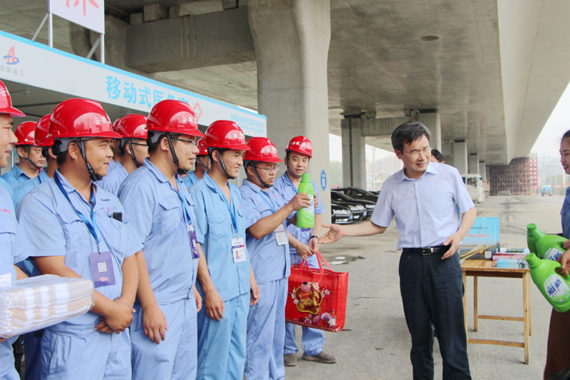 張?zhí)炫嘁恍信c項目部職工一一握手,關(guān)切的叮囑要注意防暑降溫、保重身體。張廳長認(rèn)真聽取了項目負(fù)責(zé)人關(guān)于工程施工情況的匯報,實地參觀了施工現(xiàn)場設(shè)置的移動醫(yī)務(wù)室和移動茶水亭,仔細(xì)詢問防暑降溫各項保障工作,對項目部細(xì)致、周密、人性化的防暑降溫保障措施,給予了充分肯定。他要求項目部要妥善安排施工計劃,避開高溫時段,合理安排作息時間,確保廣大一線建設(shè)者人身安全和健康。