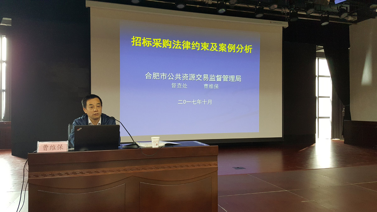 22日全天的培訓(xùn),邀請(qǐng)到了合肥市公共資源交易監(jiān)督管理局督察處曹維保處長進(jìn)行授課。曹處長從招標(biāo)管理工作的法規(guī)制度、招標(biāo)過程規(guī)范要求及招投標(biāo)實(shí)施過程中的案例分析、新形勢(shì)下招投標(biāo)采購工作熱點(diǎn)問題疑難解析、招投標(biāo)采購管理與監(jiān)督管理難點(diǎn)等,結(jié)合自身工作管理經(jīng)驗(yàn),給參培人員上了一堂操作層面的實(shí)戰(zhàn)課。