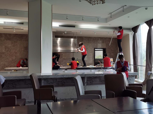合肥酒店黨支部組織全體黨員、中層管理人員及青年員工成立“衛(wèi)生清潔突擊隊(duì)”和“餐飲保障突擊隊(duì)”,對(duì)7個(gè)餐飲宴會(huì)廳進(jìn)行衛(wèi)生保潔工作,全力以赴保障五一婚宴服務(wù)。