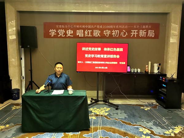 5月14日,集團(tuán)控股公司總法律顧問、集團(tuán)黨史學(xué)習(xí)教育第六宣講組組長申玉恩為服務(wù)中心全體員工就黨史學(xué)習(xí)教育作專題宣講報(bào)告。會(huì)議由中心黨總支書記、總經(jīng)理施愛民主持。