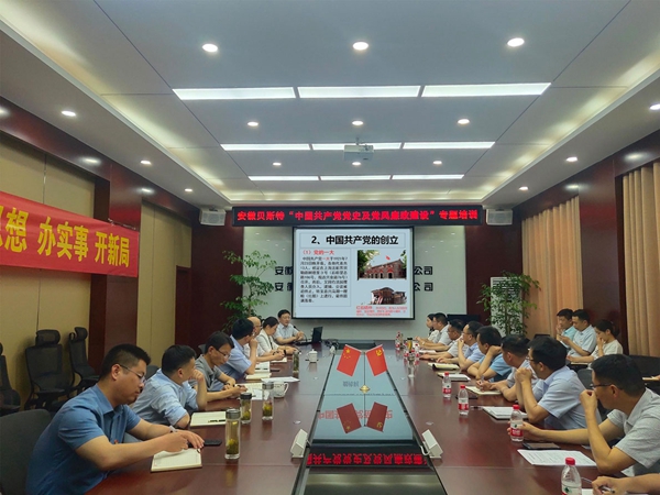 為進(jìn)一步推深做實(shí)黨史學(xué)習(xí)教育活動(dòng),提升黨員干部理論水平和政治素養(yǎng),5月28日,安徽水利貝斯特公司邀請(qǐng)中共安徽省委黨校政法部副主任、教授戴傳利作中國(guó)共產(chǎn)黨奮斗史暨黨風(fēng)廉政建設(shè)培訓(xùn),引導(dǎo)廣大黨員干部學(xué)史明理、學(xué)史增信、學(xué)史崇德、學(xué)史力行,做到學(xué)黨史、悟思想、辦實(shí)事、開(kāi)新局。公司領(lǐng)導(dǎo)班子,項(xiàng)目書(shū)記、項(xiàng)目經(jīng)理及機(jī)關(guān)全體黨員近50人參加了培訓(xùn)。