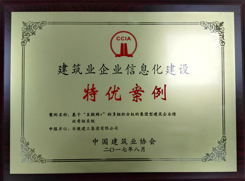 2017年11月26日至27日,中國(guó)建筑業(yè)協(xié)會(huì)全國(guó)建筑業(yè)企業(yè)信用體系建設(shè)與創(chuàng)新發(fā)展經(jīng)驗(yàn)交流會(huì)在南京舉行。中國(guó)建筑業(yè)協(xié)會(huì)會(huì)長(zhǎng)王鐵宏等協(xié)會(huì)領(lǐng)導(dǎo)出席會(huì)議,會(huì)議由副秘書長(zhǎng)吳濤主持。建工集團(tuán)榮獲“中國(guó)建筑業(yè)競(jìng)爭(zhēng)力200強(qiáng)企業(yè)”,集團(tuán)申報(bào)的《基于“互聯(lián)網(wǎng)+”的多組織分權(quán)的集團(tuán)型建筑企業(yè)績(jī)效考核系統(tǒng)》案例榮獲“建筑業(yè)企業(yè)信息化建設(shè)特優(yōu)案例”,在會(huì)上接受了中國(guó)建筑業(yè)協(xié)會(huì)的授牌及證書。這是繼2016年榮獲第二屆全國(guó)建筑業(yè)企業(yè)信息化建設(shè)特優(yōu)案例之后,集團(tuán)再次獲此殊榮。