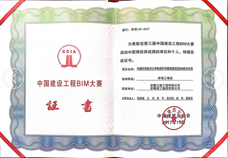 日前,由中國建筑協(xié)會主辦的“建設(shè)工程BIM技術(shù)成果推廣應(yīng)用經(jīng)驗交流會”在廈門召開。會上對第三屆中國建設(shè)工程BIM大賽獲獎單位和個人頒發(fā)榮譽證書。集團公司組織安徽路橋完成的“BIM技術(shù)在特大型鋼管拱橋中的探索應(yīng)用”獲得二等獎,組織安徽三建完成的“中國科學(xué)技術(shù)大學(xué)物質(zhì)科學(xué)教研樓項目BIM技術(shù)應(yīng)用”獲得三等獎。
