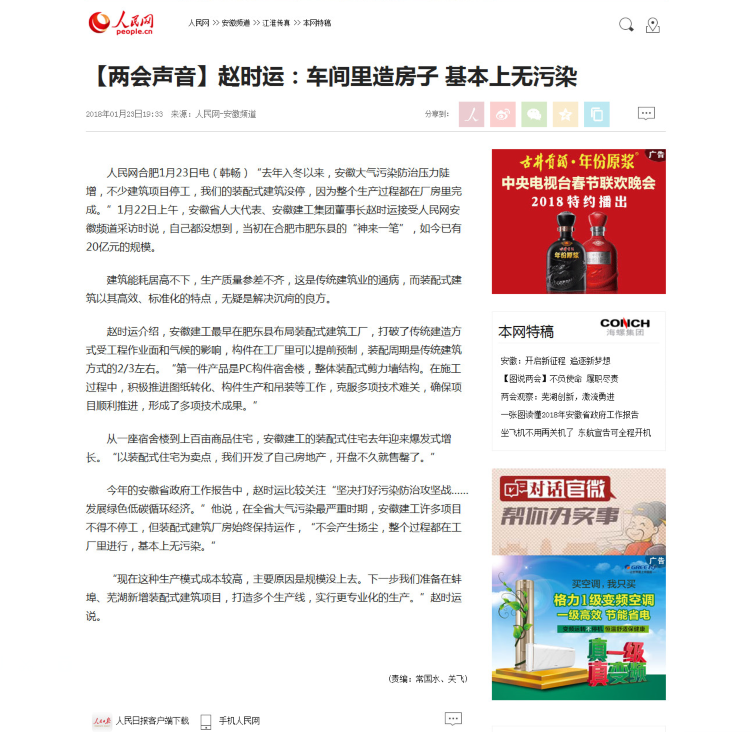 1月22日上午,安徽省第十三屆人民代表大會第一次會議在安徽大劇院隆重開幕。省人大代表、省十三屆人大一次會議計劃和預算審查委員會委員,安徽建工集團董事長、黨委書記趙時運出席會議。當天上午,趙時運代表現場就“堅決打好污染防治攻堅戰(zhàn)、推進裝配式建筑”接受人民網安徽頻道記者采訪。