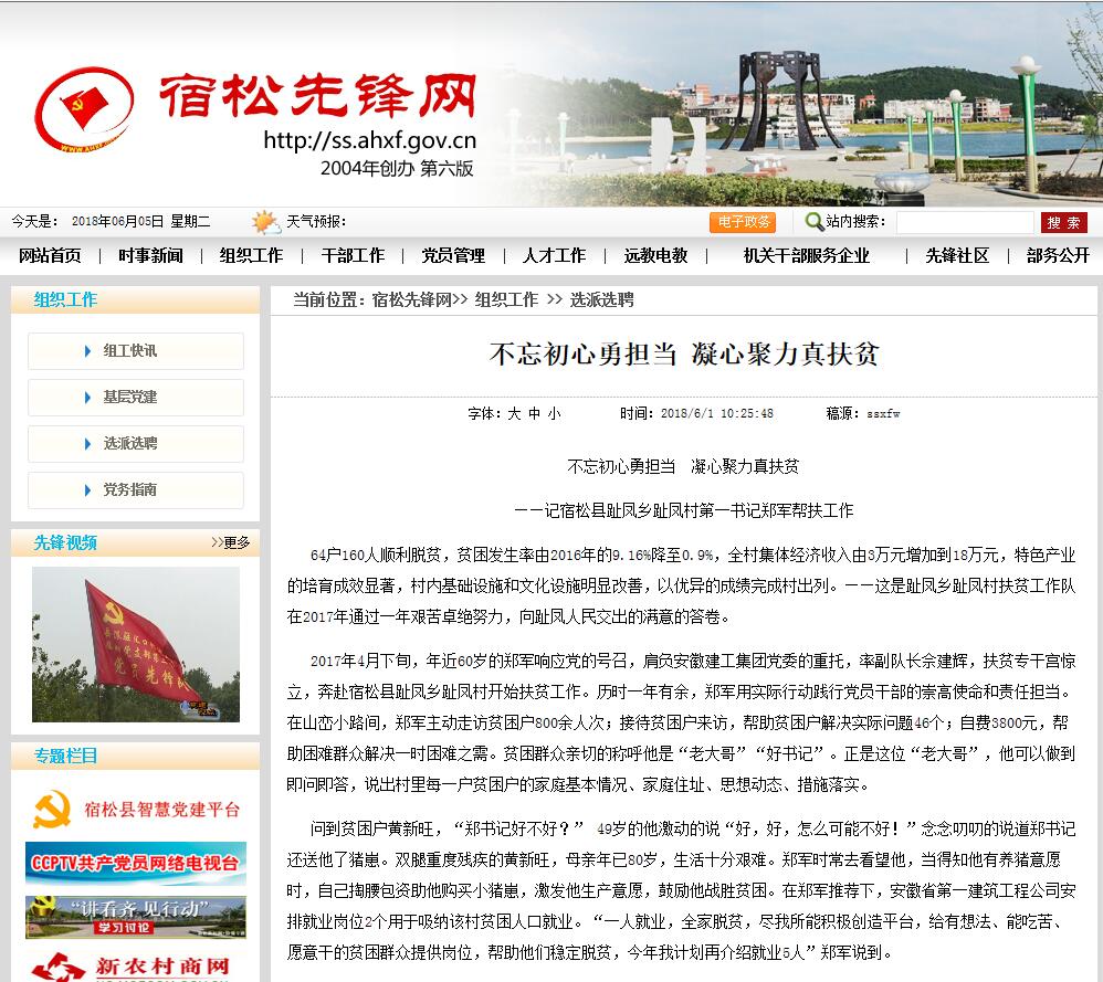 6月1日,《宿松先鋒網(wǎng)》以《不忘初心勇?lián)?dāng) 凝心聚力真扶貧》為題,對安徽建工集團(tuán)自2017年4月以來,積極響應(yīng)黨和國家號召,情系貧困群眾、創(chuàng)新扶貧方式的典型做法和顯著成效等進(jìn)行了專題報道。