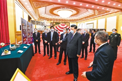 人民大會(huì)堂北大廳氣氛喜慶熱烈。上午10時(shí)許,習(xí)近平等黨和國(guó)家領(lǐng)導(dǎo)同志步入會(huì)場(chǎng),向參研參試人員代表?yè)]手致意,全場(chǎng)響起經(jīng)久不息的掌聲。習(xí)近平同孫家棟、欒恩杰等親切交流,并同大家合影留念。