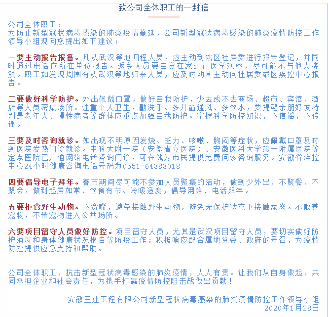 疫情牽動億萬人心。黨中央、國務(wù)院高度重視疫情防治工作,習(xí)近平總書記作出重要指示,強調(diào)要把人民群眾生命安全和身體健康放在第一位,堅決遏制疫情蔓延勢頭。安徽三建公司黨委迅速行動,積極貫徹落實黨中央、國務(wù)院和省委、省政府、省國資委和集團(tuán)公司關(guān)于新型冠狀病毒肺炎疫情防控工作部署要求,在春節(jié)前重點部署武漢項目人員疫情防控工作的基礎(chǔ)上,1月27日發(fā)出緊急通知,全面落實公司防控工作。