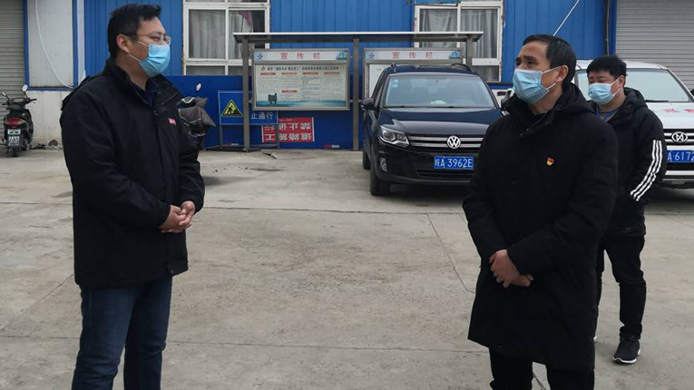 2月14日上午,固鎮(zhèn)縣住建局局長陳大鵬赴安建建設(shè)公司第四工管部檢查指導疫情防控工作,第四工管部負責人盧朋陪同。