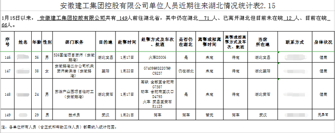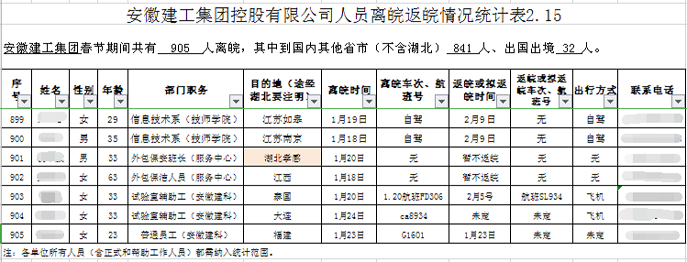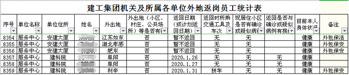 為了做好復(fù)工復(fù)產(chǎn)準(zhǔn)備,2月5日,人員防控組編制了《集團(tuán)機(jī)關(guān)及所屬各單位外地返崗員工統(tǒng)計(jì)表》,要求各單位全面統(tǒng)計(jì)離開(kāi)工作所在地情況。鑒于建筑行業(yè)特殊性,集團(tuán)下屬機(jī)構(gòu)眾多,職工人數(shù)多,且分散在境外及全國(guó)各地,適逢春節(jié)往返,人員排查工作量較大,防控壓力較大。為做到摸排全覆蓋,一是要求各單位將在冊(cè)在崗員工、勞務(wù)派遣人員、項(xiàng)目外聘人員等全部納入統(tǒng)計(jì)范圍,每日更新報(bào)送。二是將合肥市區(qū)外的四縣一市納入統(tǒng)計(jì)范圍,確保全體返崗職工排查全覆蓋,各項(xiàng)防控措施落實(shí)全覆蓋。截至2月15日,集團(tuán)共有8359位員工離開(kāi)工作地。