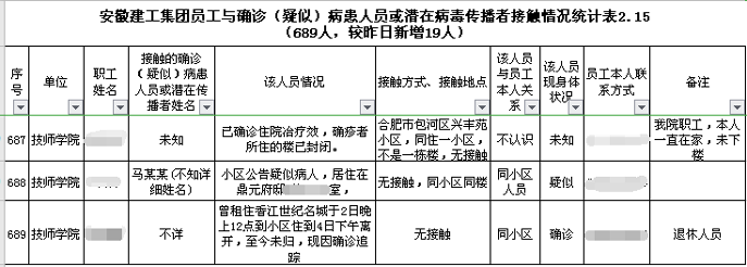 嚴(yán)格落實(shí)省委省政府、省國(guó)資委黨委要求,結(jié)合集團(tuán)人員分散實(shí)際,先后開(kāi)展了出現(xiàn)相關(guān)癥狀人員情況排查,離皖返皖員工情況排查,近期往來(lái)湖北人員情況排查,與確診(疑似)病患或潛在病毒傳播者接觸情況排查,重點(diǎn)對(duì)出現(xiàn)相關(guān)癥狀、往返疫區(qū)、離皖返皖、外地返崗、有密切接觸可能的人員進(jìn)行實(shí)時(shí)關(guān)注和每日情況摸排,密切關(guān)注職工身體狀況。對(duì)符合自我隔離條件的各類人員作出明確規(guī)定,確保及時(shí)發(fā)現(xiàn)、及時(shí)報(bào)告和隔離,不留感染隱患。據(jù)統(tǒng)計(jì),春節(jié)期間集團(tuán)共有905人離皖,其中到國(guó)內(nèi)其他省市(不含湖北)841人、出國(guó)出境32人,全部逐一登記,有案可查。同時(shí),對(duì)1月15日以來(lái)前往湖北省的149人進(jìn)行詳細(xì)排查登記,其中仍在湖北71人、已離開(kāi)湖北但目前未在皖 12 人、目前在皖 66人,全程掌握情況;對(duì)與確診(疑似)病患人員或潛在病毒傳播者接觸的689人全面排查,登記備案,積極配合屬地政府和所在社區(qū)加強(qiáng)疫情防控宣傳教育,做好自我隔離等各項(xiàng)防控工作,確保各項(xiàng)管控措施落實(shí)到位。