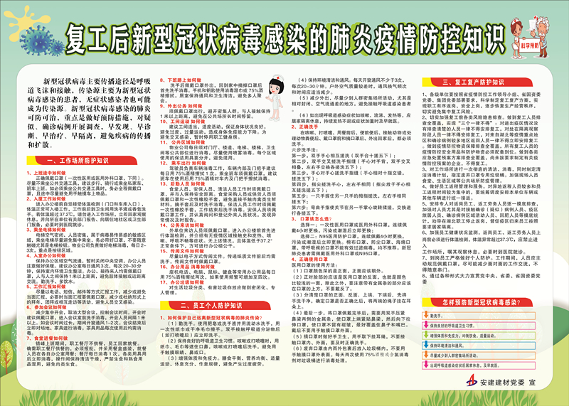 自新冠肺炎疫情發(fā)生以來(lái),安建建材認(rèn)真貫徹落實(shí)習(xí)近平總書(shū)記關(guān)于疫情防控工作的重要講話(huà)和重要指示批示精神,嚴(yán)格按照上級(jí)黨委決策部署和工作要求,公司上下高度重視、周密部署,廣大黨員職工勇于擔(dān)當(dāng)、甘于奉獻(xiàn),全力以赴做好疫情防控工作,安全有序推進(jìn)復(fù)工復(fù)產(chǎn),確保疫情防控和生產(chǎn)經(jīng)營(yíng)兩不誤。