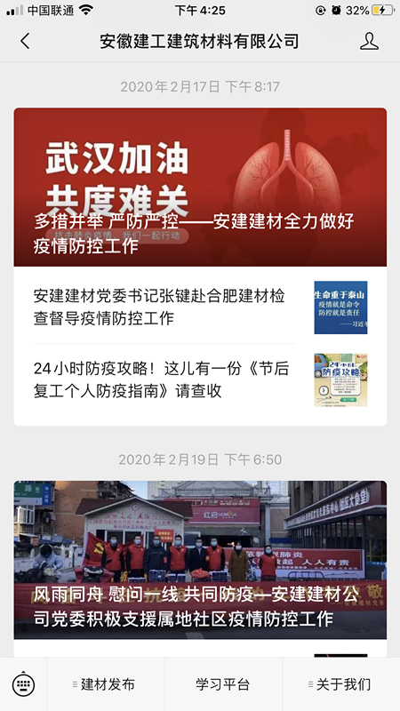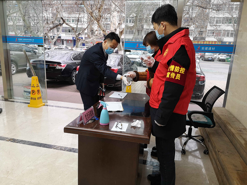 自疫情發(fā)生以來(lái),公司第一時(shí)間通過(guò)網(wǎng)站、微信公眾號(hào)、辦公群、宣傳欄等渠道傳達(dá)疫情防控要求,普及防疫知識(shí),傳播積極正能量,樹(shù)立建材國(guó)企擔(dān)當(dāng)?shù)男蜗?。組織公司職工開(kāi)展線(xiàn)上安全培訓(xùn),強(qiáng)化員工自主學(xué)習(xí),并通過(guò)公司教育學(xué)習(xí)平臺(tái)開(kāi)展安全知識(shí)測(cè)試,以考促學(xué),提高疫情防控能力。積極表彰蚌埠建材先進(jìn)集體事跡,傳遞正能量,激發(fā)廣大職工干事創(chuàng)業(yè)的信心。機(jī)關(guān)黨總支于2月24日復(fù)工起設(shè)立了黨員先鋒崗,黨員志愿者做好大廈登記、體溫檢測(cè)、分發(fā)防疫物質(zhì)等,宣傳個(gè)人防護(hù)知識(shí),建起了一線(xiàn)黨員“防疫墻”。