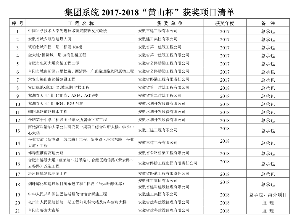近日,安徽省住房和城鄉(xiāng)建設(shè)廳發(fā)布《關(guān)于公布2017-2018年度安徽省建設(shè)工程“黃山杯”獲獎(jiǎng)項(xiàng)目名單的通知》(建質(zhì)函[2019]687),全省共有162個(gè)項(xiàng)目獲獎(jiǎng),其中集團(tuán)系統(tǒng)共有安建海外公司承建的中華人民共和國(guó)駐巴基斯坦使館館舍新建工程、安徽三建承建的中國(guó)科學(xué)技術(shù)大學(xué)先進(jìn)技術(shù)研究院研發(fā)實(shí)驗(yàn)樓等21項(xiàng)工程榜上有名,獲獎(jiǎng)工程數(shù)量占總量的13%;集團(tuán)所屬施工板塊10家單位有8家獲獎(jiǎng),另外安徽建科監(jiān)理公司作為監(jiān)理單位參報(bào)也獲得了2項(xiàng)“黃山杯”,總體成績(jī)喜人,體現(xiàn)了集團(tuán)公司工程建設(shè)整體較高的質(zhì)量管理水平。