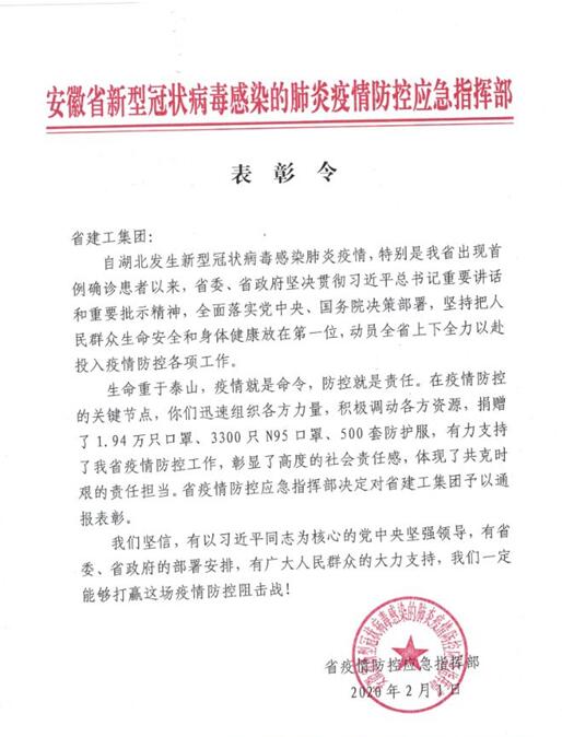 近日,集團受到省疫情防控應急指揮部通報表彰,對集團響應政府號召、加大海外醫(yī)療防疫物資采購力度馳援國內(nèi)疫情防控給予了高度評價。表彰令指出:“在疫情防控的關(guān)鍵節(jié)點,安徽建工集團迅速組織各方力量,調(diào)動各方資源,有力支持了我省疫情防控工作,彰顯了高度的社會責任感,體現(xiàn)了共克時艱的責任擔當。”