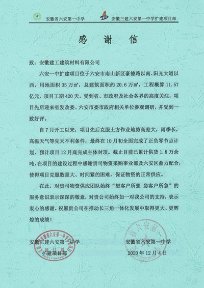 日前,公司收到安徽省六安第一中學感謝信,信件表達了對安建建材“想客戶所想,急客戶所急”高質(zhì)量供應服務的充分認可,充分肯定了公司的資源整合及保供能力。
