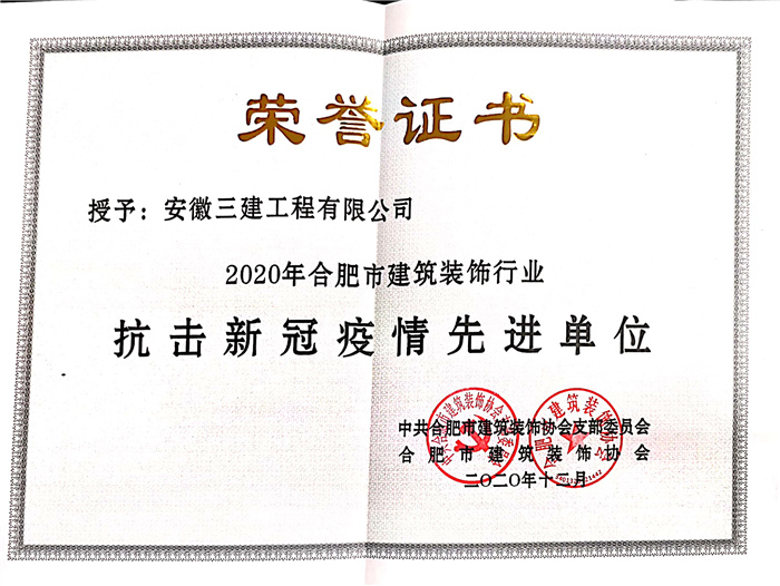 近日,經(jīng)合肥市建筑裝飾協(xié)會(huì)評(píng)選,安徽三建公司被授予2020年度“合肥市建筑裝飾優(yōu)秀企業(yè)”和“合肥市建筑裝飾行業(yè)抗擊新冠疫情先進(jìn)單位”稱號(hào)。安徽三建公司已經(jīng)連續(xù)多年獲“合肥市建筑裝飾優(yōu)秀企業(yè)”榮譽(yù)。由于在抗擊疫情中的突出貢獻(xiàn),此前公司已獲得“安徽省抗擊新冠疫情先進(jìn)集體”“全國(guó)住房和城鄉(xiāng)建設(shè)系統(tǒng)抗擊新冠肺炎疫情先進(jìn)集體”稱號(hào)。