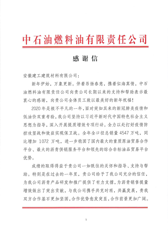 此次中石油燃料油公司給安建建材送來(lái)感謝信,標(biāo)志著雙方合作邁向了一個(gè)新的臺(tái)階。隨著雙方的合作升級(jí),相信在未來(lái)能夠繼續(xù)深入探討共贏新模式,開(kāi)辟合作新征程。