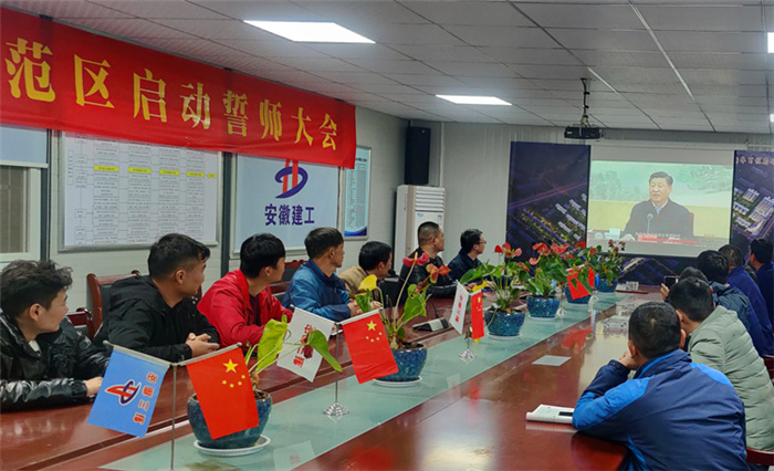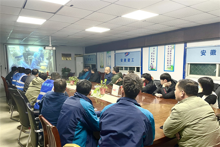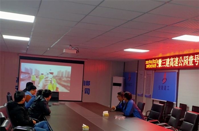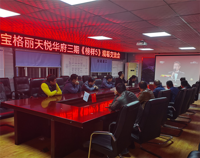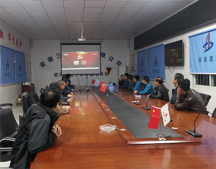 在六安第一中學(xué)擴建項目會議室,當(dāng)天晚上參與項目建設(shè)的四公司、安裝公司、門窗公司聯(lián)合組織項目黨員及管理人員集中觀看專題片。次日一早,裝飾也組織六安一中項目參戰(zhàn)管理人員集中收看專題片,汲取榜樣力量。