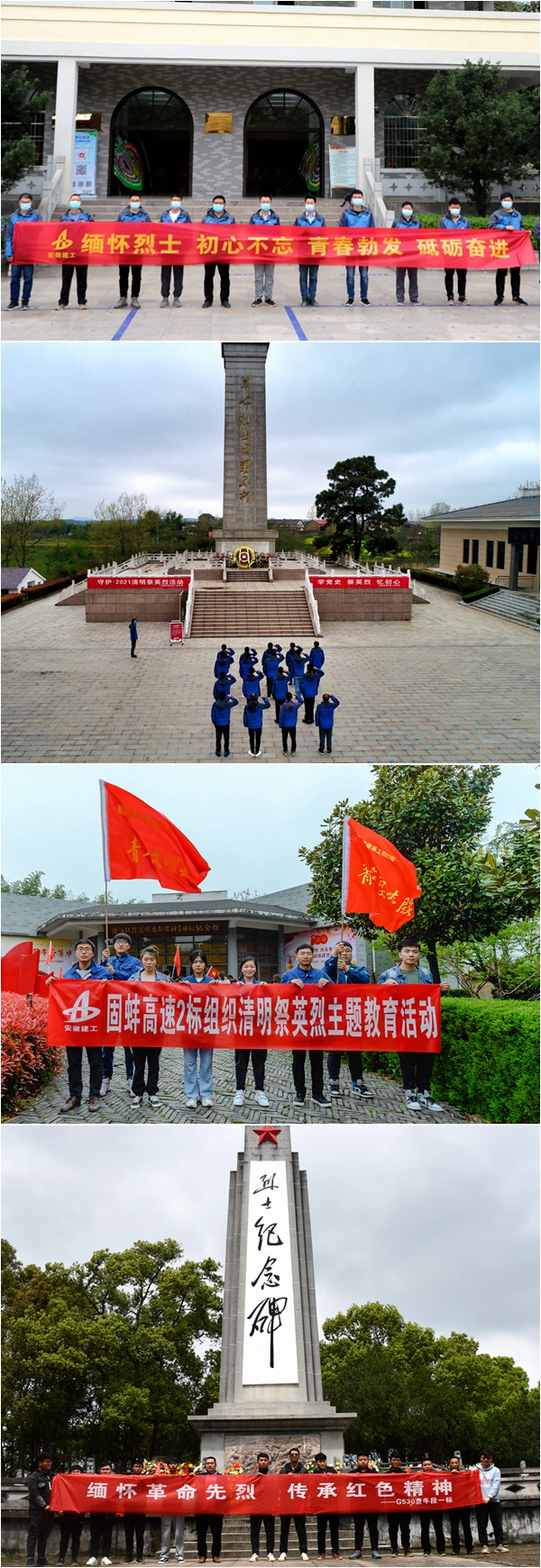 蒙城PPP項(xiàng)目黨支部組織黨員和職工來(lái)到蒙城縣革命烈士陵園掃墓祭奠,向革命烈士敬獻(xiàn)花籃,表達(dá)哀思;淮北片區(qū)黨支部組織黨員、團(tuán)員青年和職工瞻仰泗縣烈士陵園,銘記歷史,致敬革命先烈;合肥軌道交通3號(hào)線南延2標(biāo)項(xiàng)目黨支部前往新四軍江北指揮部開(kāi)展黨史教育,重溫入黨誓詞,牢記初心使命;引江濟(jì)淮聯(lián)合黨支部追尋紅色足跡,在茶壺山烈士陵園紀(jì)念碑前,唱響國(guó)歌,靜思默哀;暢通二環(huán)(西南環(huán))項(xiàng)目黨支部組織開(kāi)展“網(wǎng)上祭英烈”活動(dòng),廣大黨員、團(tuán)員青年和職工登陸網(wǎng)上紀(jì)念館,緬懷革命先烈,表達(dá)對(duì)英雄的敬意。