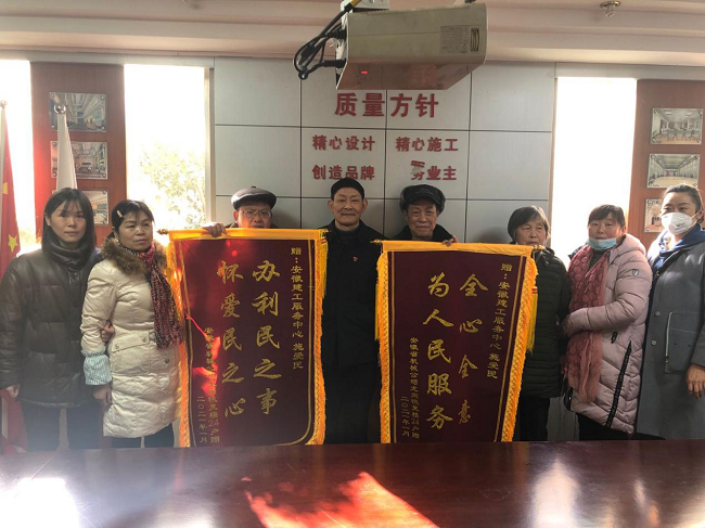 為安徽省機(jī)械施工公司龍崗集資樓24戶(hù)辦理了12年來(lái)未辦成的房產(chǎn)證問(wèn)題,接到房產(chǎn)證之際,住戶(hù)們特地送來(lái)兩面錦旗—“辦利民之事,懷愛(ài)民之心”、“全心全意為人民服務(wù)”,表達(dá)了對(duì)黨總支書(shū)記、總經(jīng)理施愛(ài)民為他們辦實(shí)事的感激之情。