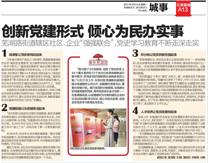 2021年5月24日,《江淮晨報》以“創(chuàng)新黨建形式、傾心為民辦實事”為題,專題報道安建建材黨史學(xué)習(xí)教育開展情況?!督闯繄蟆分赋觯谑徍方值?,以城南社區(qū)、安建建材為代表的的社區(qū)和企業(yè)紛紛創(chuàng)新學(xué)習(xí)形式,著力聚焦“學(xué)黨史、悟思想、辦實事、開新局”,不斷推進黨史學(xué)習(xí)教育走深走實。同時也在學(xué)習(xí)強國合肥市學(xué)習(xí)平臺進行報道。