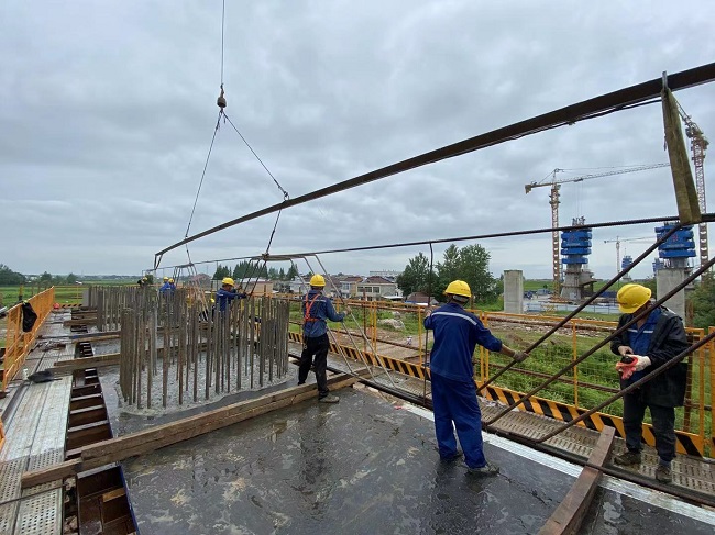 在開工前,項目部精心組織,合理安排。相關(guān)技術(shù)人員進行了支撐平臺的的專項驗收,科學布控施工組織,在原材、配合比、運輸、布料方法、澆筑速度等環(huán)節(jié)嚴格把控,安排專人全程監(jiān)測支撐平臺。由于受場地地基基礎(chǔ)限制,施工難度較大,項目部技術(shù)人員克服困難、潛心鉆研,反復驗算推演,采用穿心棒法進行施工。在澆筑過程中,工人協(xié)作緊密,有條不紊地進行蓋梁澆筑作業(yè),技術(shù)人員密切關(guān)注澆筑過程中的每個細節(jié),認真指導,及時優(yōu)化調(diào)整施工中出現(xiàn)的問題。