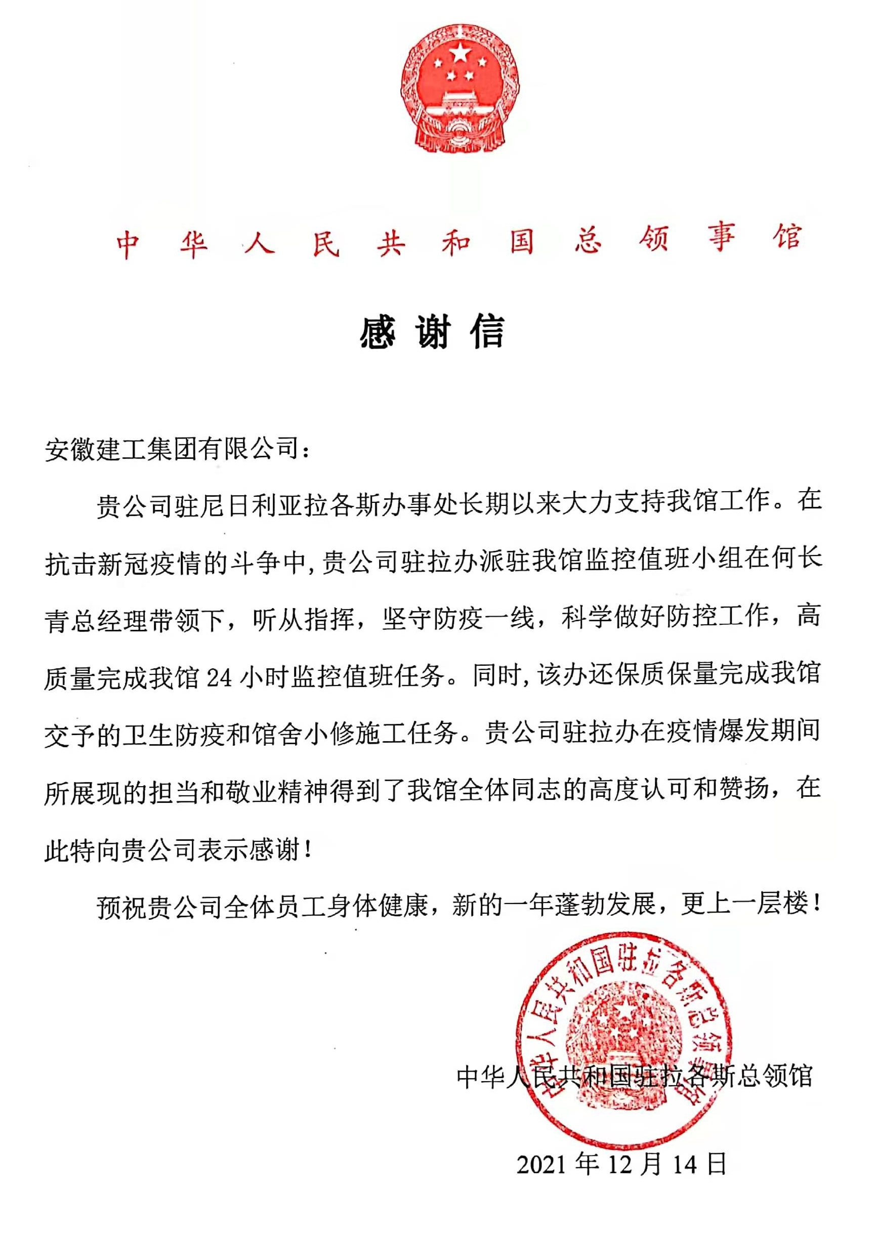 安徽建工集團(tuán)收到中國(guó)駐拉各斯總領(lǐng)館感謝信