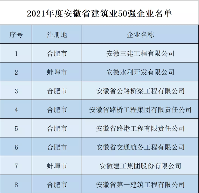 2月10日,省住房城鄉(xiāng)建設(shè)廳公布2021年度安徽省建筑業(yè)10強(qiáng)縣(市)、10強(qiáng)區(qū)、50強(qiáng)企業(yè)名單,建工控股共有8家單位入選2021年度安徽省建筑業(yè)50強(qiáng)企業(yè)。