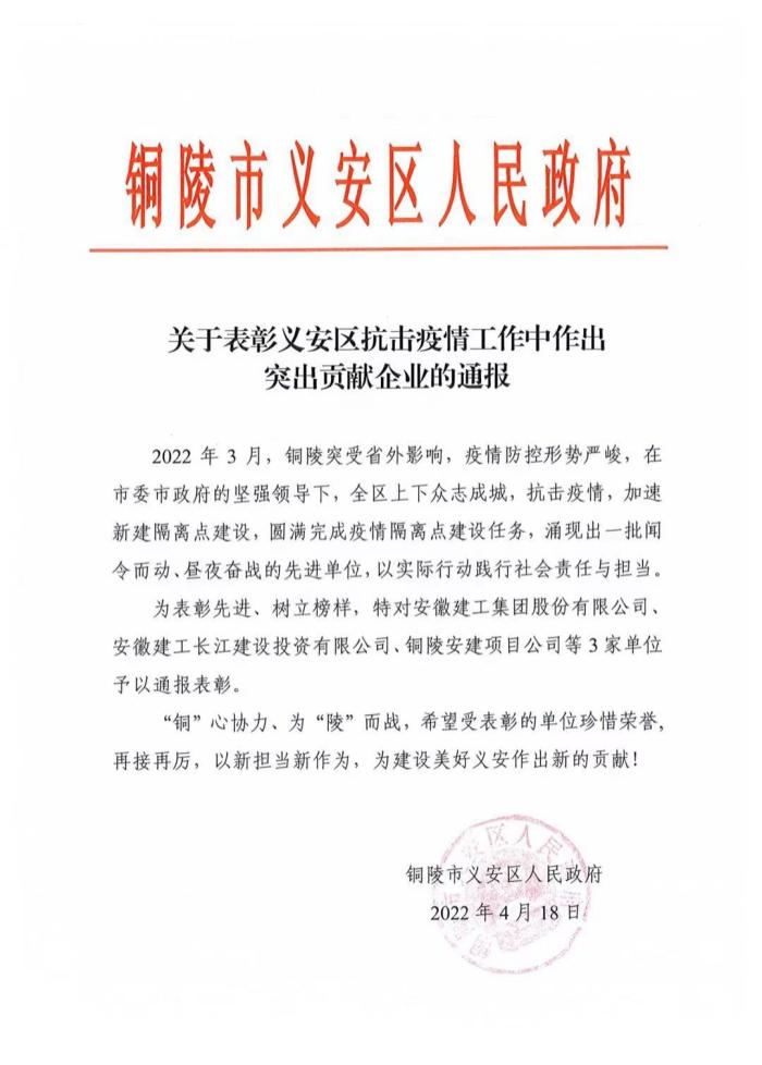近日,安徽建工和長(zhǎng)江建投獲銅陵市義安區(qū)人民政府通報(bào)表彰。通報(bào)指出,安徽建工和長(zhǎng)江建投等先進(jìn)單位積極響應(yīng)銅陵市委市政府號(hào)召,聞令而動(dòng)晝夜奮戰(zhàn),圓滿完成疫情應(yīng)急隔離點(diǎn)建設(shè)任務(wù),以實(shí)際行動(dòng)踐行省屬國(guó)企的社會(huì)責(zé)任與擔(dān)當(dāng)。