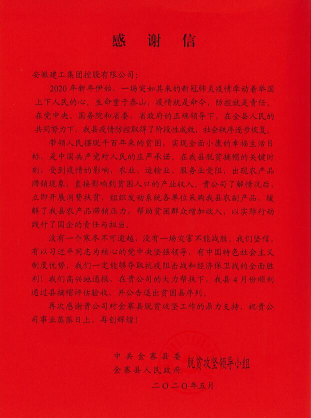 近日,集團(tuán)收到中共金寨縣委、金寨縣人民政府脫貧攻堅(jiān)領(lǐng)導(dǎo)小組的感謝信,對(duì)集團(tuán)在疫情期間大力開(kāi)展消費(fèi)扶貧,幫助金寨縣解決農(nóng)副產(chǎn)品滯銷(xiāo)問(wèn)題的義舉給予了高度評(píng)價(jià)和衷心感謝。