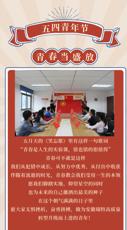 在五四青年節(jié)來臨之際,安徽瑞特團支部組織觀看《電影黨課:五四精神》微視頻,點燃青年職工愛國熱情;通過召開五四青年職工在專題座談會面對面交流分享建團百年心得感悟、重溫入團誓詞、與團旗合影,進一步筑牢愛國、愛企情懷;在五四青年節(jié)當天,團支部發(fā)出五四青春寄語,引導青年職工將五四精神融入青年奮斗,譜寫新時代華章,為公司高質(zhì)量轉(zhuǎn)型升級貢獻青年力量。